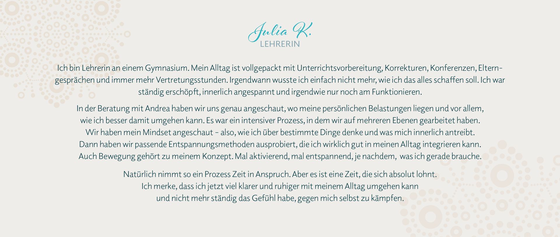 Weg zu mehr Gelassenheit und mentaler Stärke sein. In der persönlichen Beratung im Rahmen von JUST YOU schauen wir uns gemeinsam an, welche Stressfaktoren Dich belasten, welche Ressourcen Du bereits hast und welche Strategien Dir wirklich helfen.